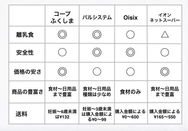 その中で子育てママに必要な離乳食・幼児食の商品がある業者を中心にピックアップした結果、コープふくしまの他に「Oisix (オイシックス)」「パルシステム」の宅配がありました。
