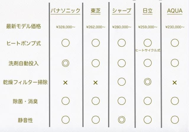 の3つをチェックできると良いと思います。以下の表では大手メーカー5社の最新モデルを基準にママが「気になる」or「あると嬉しい機能」を簡単に比較しています。