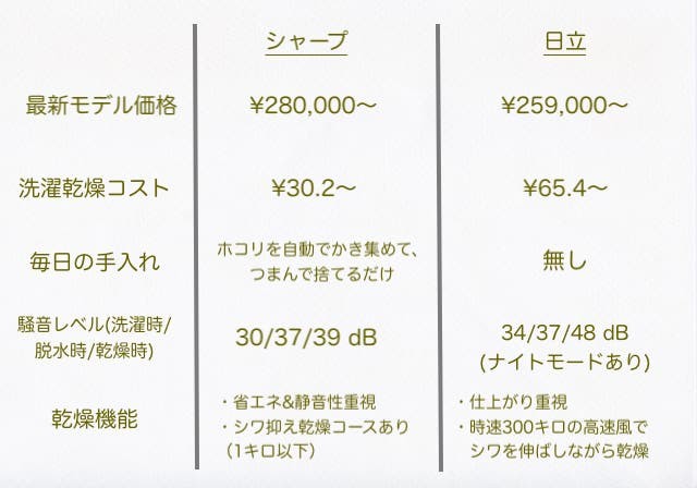 シャープと日立の洗濯乾燥機の特徴を比べると、
