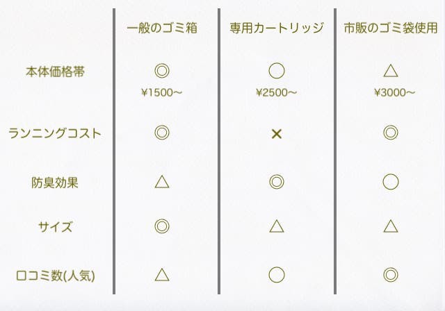 「一般のゴミ箱」「専用カートリッジのゴミ箱」「市販のゴミ袋使用のゴミ箱」の3つを紹介しましたがメリットとデメリットをわかりやすく比較表にしたので良かったら参考にしてみてください。