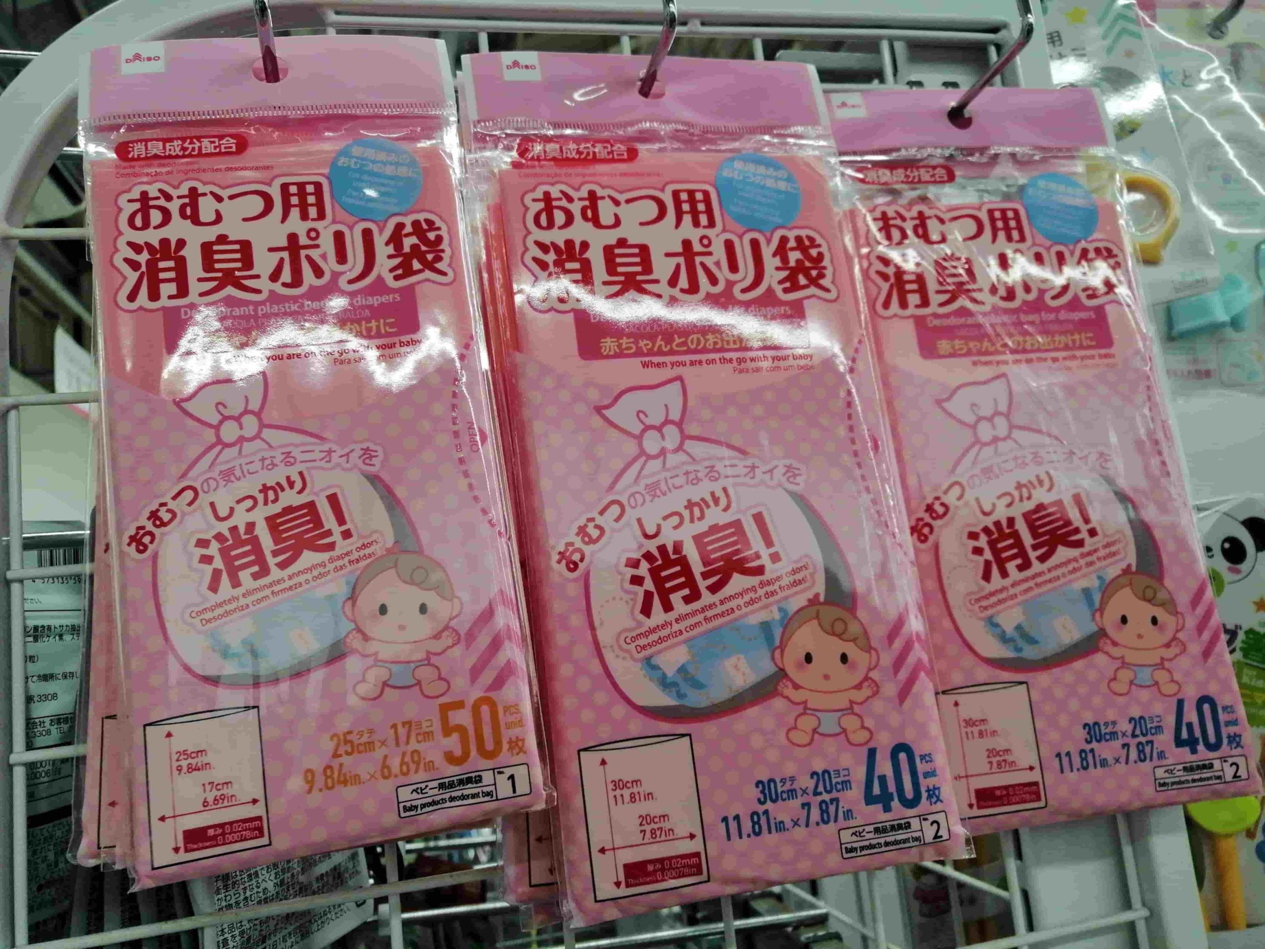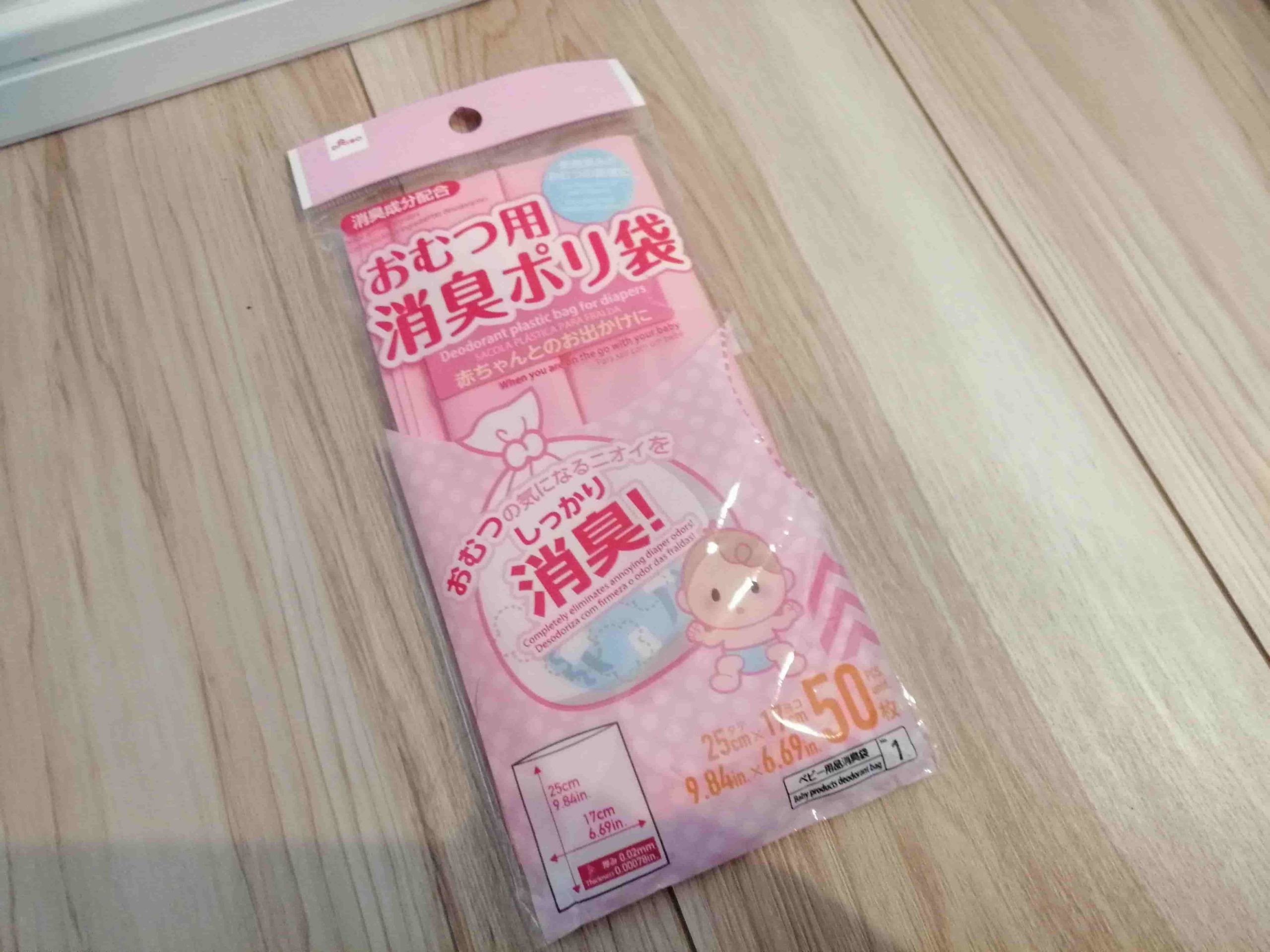 おむつ消臭袋は市販でも色々ありますが50枚入りで100円というコスパ最強のDAISOの消臭袋を我が家では使っています。