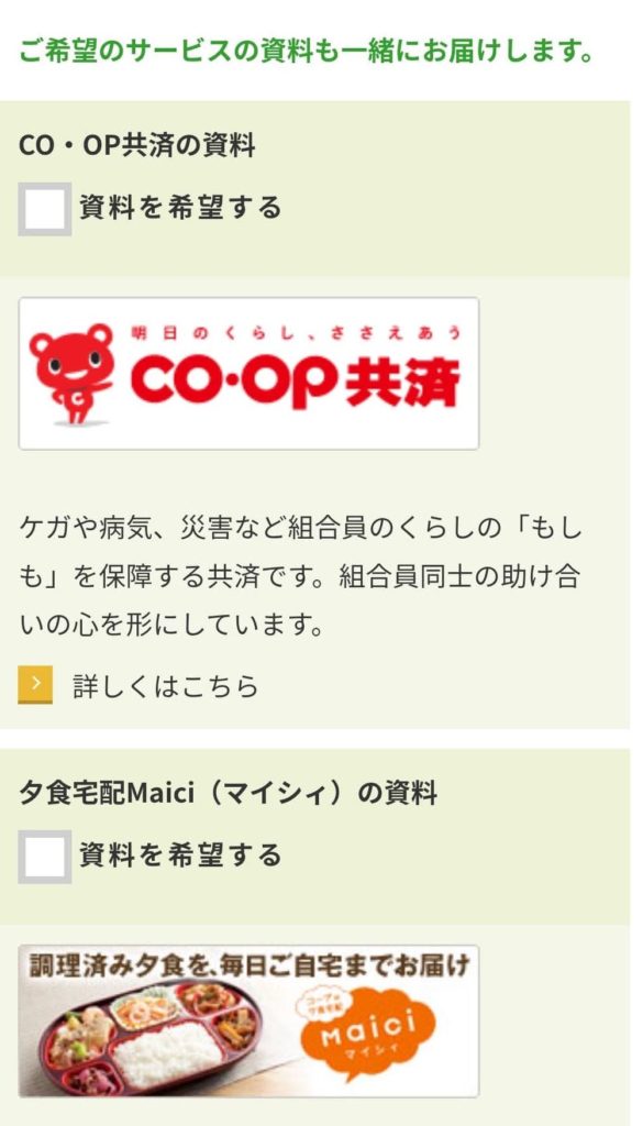 コープの宅配の資料請求・お試し体験申し込み画面に進むとコープ共済の資料請求のチェック欄があり、一緒に請求出来るようになっています。
