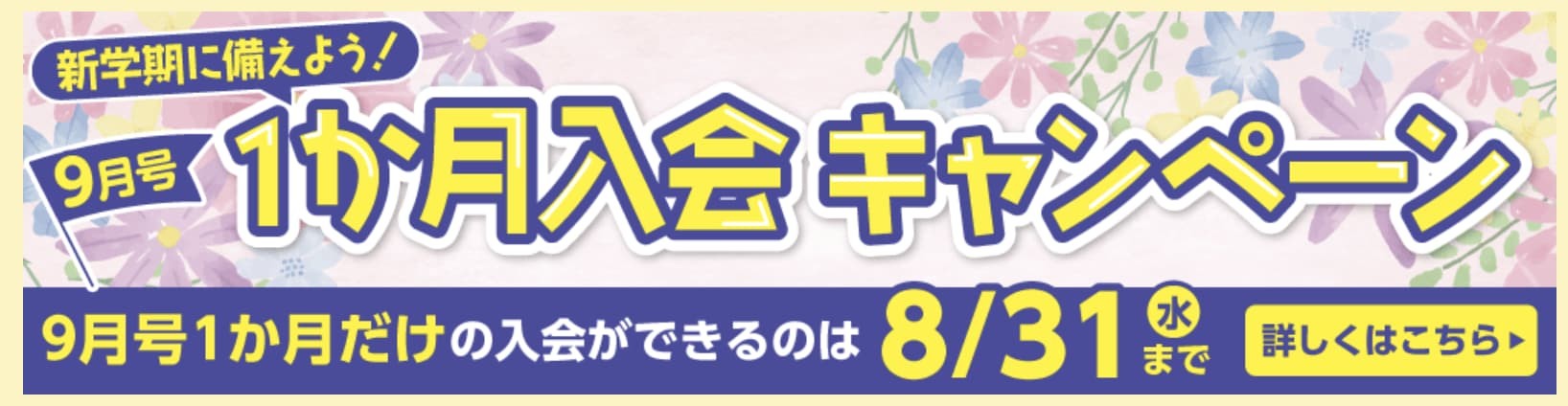 ポピーは無料でもらえる「おためし見本」がありますが、「1ヶ月限定入会キャンペーン」も実施中です。「おためし見本だけだと物足りない」「続けられるか不安」「子どもに合うかわからない」というママにはピッタリのキャンペーンです。入会申込フォーム内の「お申し込み教材選択」で「1か月入会 〇〇〇9月号」を選択してください。ぜひおためしください。