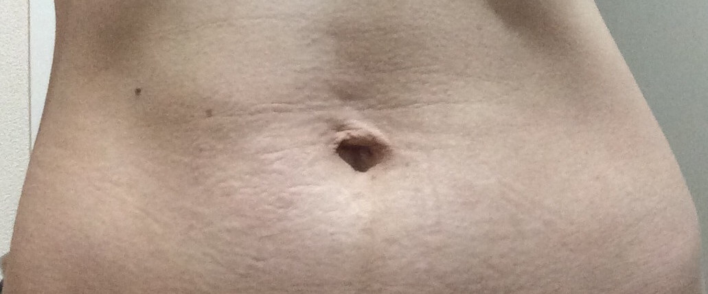 産まれたはずの1人がまだお腹に入っている状態で下にダラ〜ンと垂れて皮膚も腹筋もふにゃふにゃしわしわ状態です。正中線は黒ずんでいて、妊娠中に広がり中身が飛び出たおへそも縮むことはなく、行き場をなくし伸び切ったままとなっていました…。