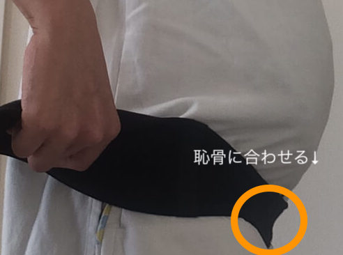 ①の恥骨に合わせることが重要です。恥骨の位置より上に合わせてしまうと赤ちゃんがいるお腹を圧迫してしまうので注意です。でもお腹の膨らみが終わる所に合わせてママも苦しくなければ大丈夫です。ちなみに恥骨の位置↓
