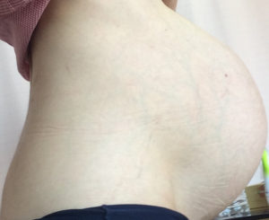 29週〜31週くらいまでは赤ちゃん2人で合計3300グラム程度だったので普通の人でもありえるお腹の大きさでした。でも臨月に相当するのでお腹は重かったです。そして32周くらいからまた一段とパン!とお腹が前にせり出しお腹の皮の余裕が無くなりパツパツになってきました。34週くらいにはもうパンパンでこれ以上膨らみません!という感覚で看護師さんも毎度「大きいね〜〜」とビックリする程でした。歩くときもお腹が下に落ちてしまいそうで軽くお腹の下を持ち上げながら歩いていました。この頃から皮が伸ばされている影響でお腹が痒くて我慢できずにちょっぴり掻いてました。35週は産まれる3日前のお腹です。むくみも出て服のゴムの跡がいっぱいついてますね…見苦しくてすいません。見返してみると私の場合は32週位からお腹が辛くなっていきました。