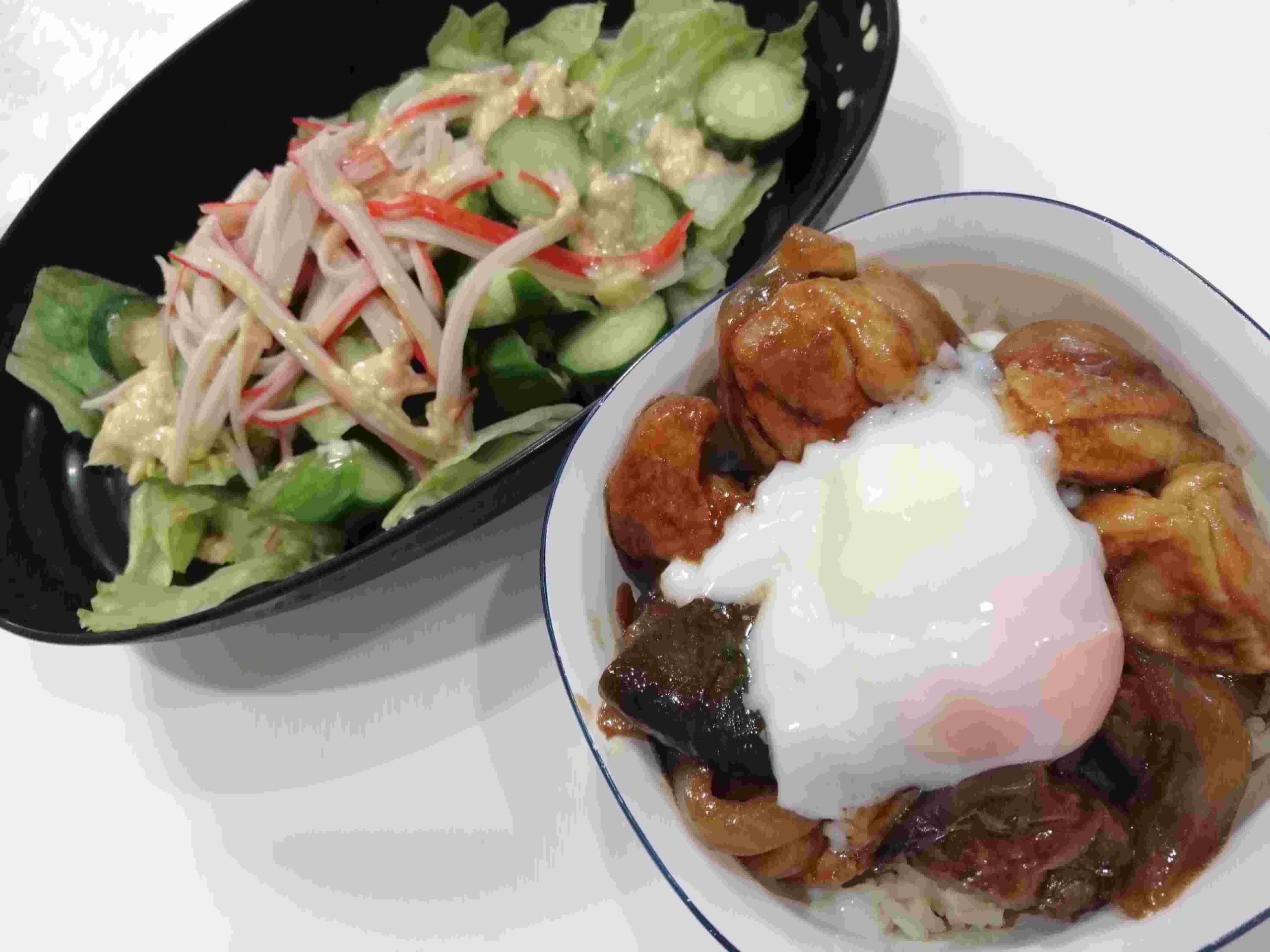 〈包丁いらず♪鶏肉のコクうまみそ丼/カニカマサラダ〉
